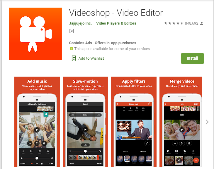 Price: Free version; VideoShow Pro version available to Android users for $19.99. In-app purchases are available for $0.99 to $179.99.